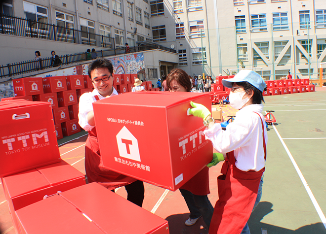 グッド・トイメーカーや生協や企業に呼びかけプレイコーナーセット製作。青森・岩手・宮城・福島の避難所や児童館300施設に寄贈を行いました。また、移動型おもちゃ美術館「木育キャラバン」を宮城県気仙沼市で開催しました。